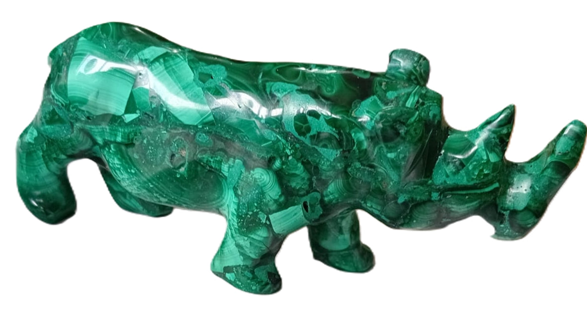 Malachite Stone Rhino Charge into style with this striking malachite stone rhino! Carved from vibrant green banded malachite, this mighty miniature brings natural beauty and bold personality to any space. A conversation starter that's as tough as the real thing—but way easier to keep as a pet!